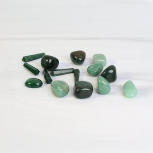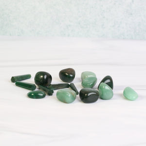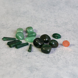 Bring balance, beauty, and natural energy into your space with the Shades of Harmony Stones collection. This curated set features 15 hand-selected stones — 5 Light Green Quartz, 5 Green Aventurine Points, and 5 Dark Green Nephrite Jade — each chosen for their soothing tones and harmonizing properties.