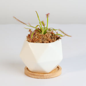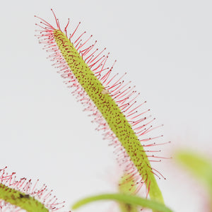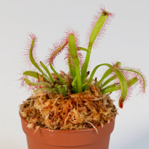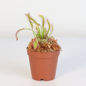 Our Cape Sundew plant, Latin name Drosera Capensis, is a favorite for a terrarium, carnivorous plant collection, or bog garden. These are "flypaper" plants that catch their prey by getting them stuck on the hairs that are on the leaves. Their leaves are like long tentacles that protrude from the center, covered in fine sticky hairs. These hairs have digestive enzymes that can turn the flys or bugs that it catches into fertilizer for the plant so using a nutrient-deficient moss medium is recommended for potting.