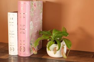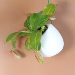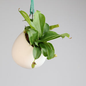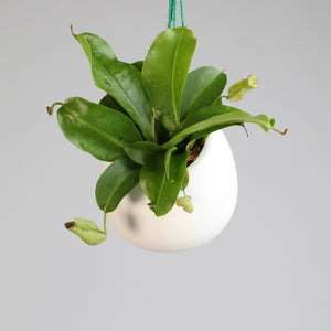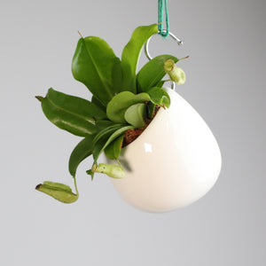 - Amelia Porcelain Hanging 4" - This plant comes packaged in a hanging white round pot ready for your home or office space with an s-hook for ease of use to hang on any wall or patio area. The bottom is flat if you want to display the plant on a shelf or table without hanging it. Does have a hole for drainage.