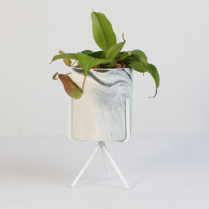- Olympia Ceramic 3.5" Marble Planter - The plant comes packaged in a grey-white marble style cylindrical porcelain planter raised on a white metal stand. Does have a hole for drainage.