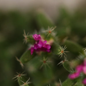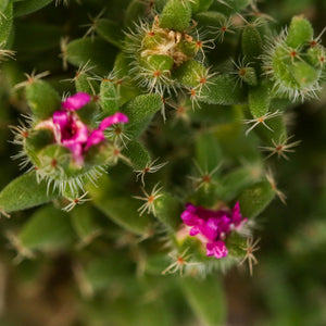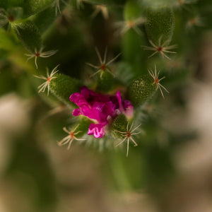Its textured, thickened trunk develops naturally over time, giving it an aged, rugged aesthetic, while the small, spiky green leaves resemble tiny pine needles. With proper care, it may even reward you with vibrant daisy-like purple blooms in the spring or summer.