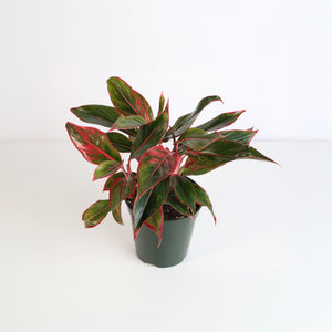 Aglaonema ‘Siam’ – also known as Chinese Evergreen ‘Siam’ – is a vibrant tropical houseplant that brings bold color and effortless beauty to any indoor space. With its stunning red-pink stems and deep green, lance-shaped leaves edged in crimson, this low-maintenance stunner is perfect for brightening up your home or workspace. Additionally, they are known for being air-purifying plants, contributing to a healthier indoor environment.