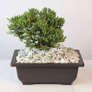 - Rectangular decorative container -Comes in decorative Bonsai dish including pebbles. Size 6.5" x 4.7" x 2.35"