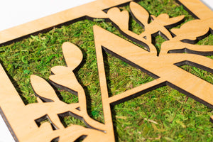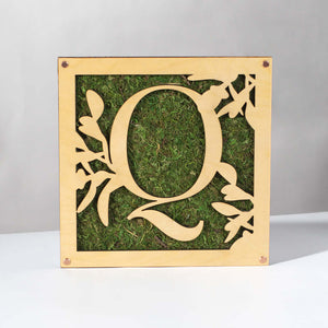 Each monogrammed piece is custom-made to order for you with the selected initial. This one is for the letter "Q." The piece is layered with the preserved moss sheet in a frame between the two custom laser-cut and hand-finished pine wooden layers.