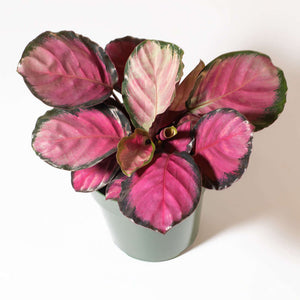 New leaves start light pink with a green tint and deepen as they mature. If this plant doesn't get sufficient humidity, its edges will start to brown a bit; although it will be perfectly healthy, that damage is irreversible. Regular misting helps keep that issue at bay. Calathea's are one of our most loved plants; they are known as the Prayer Plants and are a bit temperamental, needing the right mixture of humidity and indirect lighting