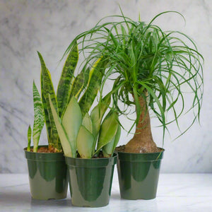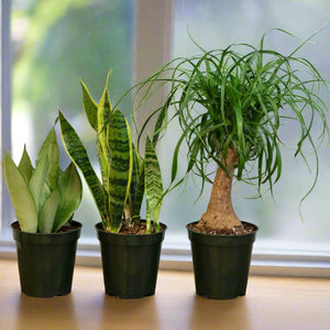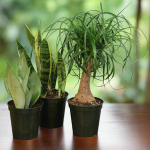 - Variegated Yellow Edge Sansevieria, Red Pony Tail Palm & Silver Moonshine Sansevieria Snake Plant
