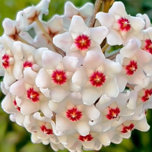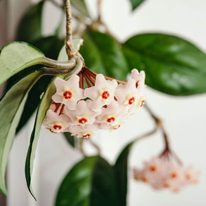 However, the real magic happens when this botanical beauty decides to bloom. The Hoya Carnosa's "Hoya" blooms are a spectacle to behold, resembling porcelain umbrellas crafted from tiny, delicate white flowers adorned with captivating red centers. The intricate flower pattern is a true marvel, enchanting onlookers with its delicate charm.