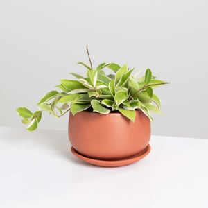 - Valentina Terracotta Pot 5" - a beautiful molded terracotta pot that is porous and fire glazed to allow plant roots to breathe; color works well with any decor and will develop a beautiful patina color over time. Includes matching dish underneath to catch water drainage and protect surfaces.