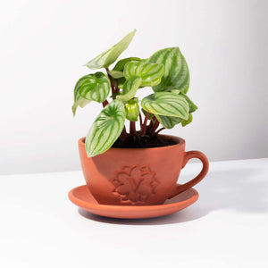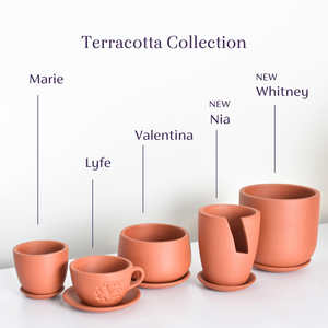 A terracotta planter that is worthy of display on any surface. This teacup-looking planter deserves to adorn your table, shelf, or cabinet. The branding on the planter shows class and elegance, a wonderful addition to your collection. The dip tray tea saucer makes it even more beautiful and homely. It feels like teatime in the country. Has the signature Verdant Lyfe "V" monogram on one side of the pot.