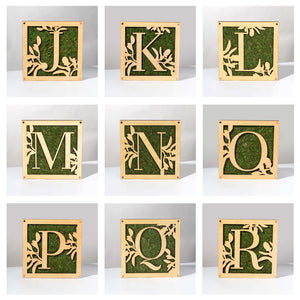Each monogrammed piece is custom-made to order for you with the selected initial. This one is for the letter "T." The piece is layered with the preserved moss sheet in a frame between the two custom laser-cut and hand-finished pine wooden layers.