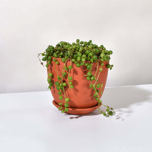 - Marie Terracotta 4" - a beautiful molded terracotta pot that is porous and fire glazed to allow plant roots to breathe, color works well with any decor and will develop a beautiful patina color over time. Includes matching dish underneath to catch water drainage and protect surfaces. It includes 4 of our 2" String of Pearls. The customer will need to re-pot the plants inside the Marie. Extra soil will be provided.
